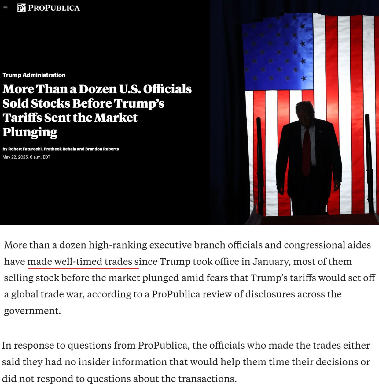 最近,美國“專業(yè)公眾”新聞?wù){(diào)查網(wǎng)站在查詢了數(shù)百份證券交易披露報(bào)告后發(fā)現(xiàn),自本屆美國政府1月上臺(tái)以來,有十幾名美國政府高級(jí)官員、國會(huì)工作人員乃至國會(huì)議員進(jìn)行了時(shí)機(jī)“恰到好處”的交易,其中大部分人在美國關(guān)稅政策導(dǎo)致市場(chǎng)暴跌之前拋售了股票;還有人則在相關(guān)法案獲批前“及時(shí)”購買了該法案所利好的行業(yè)公司股票。