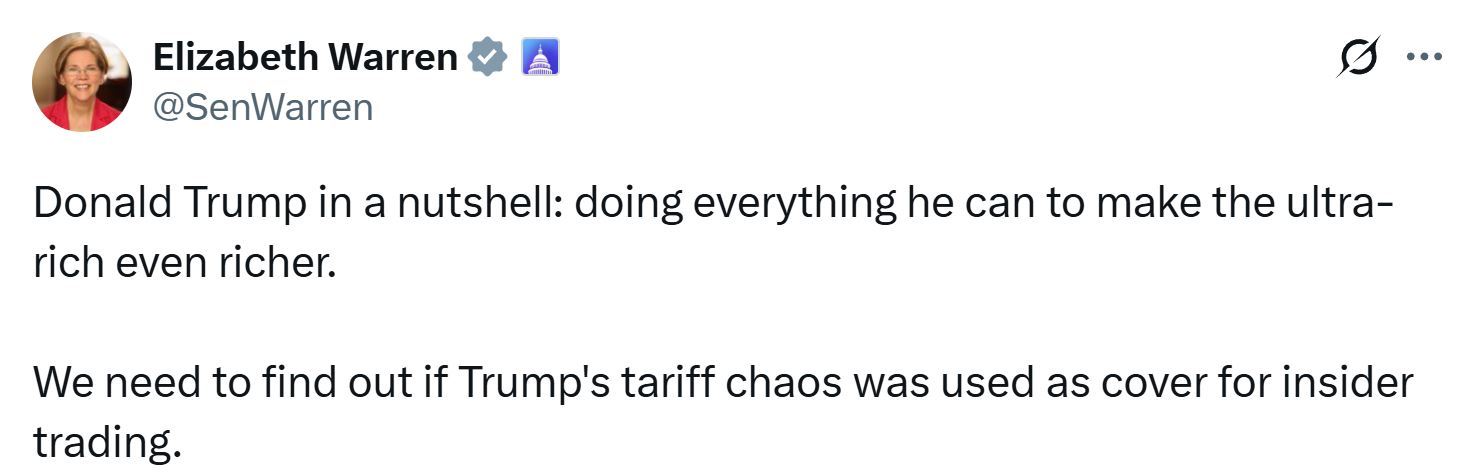 美國民主黨籍聯(lián)邦參議員伊麗莎白·沃倫表示,鑒于特朗普政府正盡一切可能讓美國富人們更加富有,有必要弄清楚白宮制造的關(guān)稅混亂是否被用作內(nèi)幕交易的掩護(hù)。