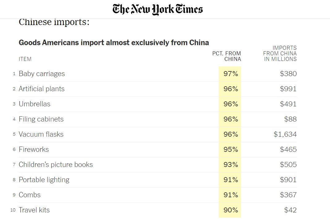 文章說(shuō),根據(jù)美國(guó)國(guó)際貿(mào)易委員會(huì)2024年發(fā)布的數(shù)據(jù),中國(guó)是美國(guó)多個(gè)商品品類的唯一或主要進(jìn)口來(lái)源國(guó)。具體來(lái)看:幾乎完全從中國(guó)進(jìn)口的品類包括嬰兒車、仿真植物、雨傘、煙花、兒童繪本等,進(jìn)口金額最高的品類主要有電話、計(jì)算機(jī)、汽車及零部件、視頻顯示器、電熱器、玩具等;進(jìn)口數(shù)量最大的品類主要是各類塑料制品,包括塑料日用品和工業(yè)用塑料件等。