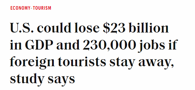 經(jīng)濟(jì)分析公司Implan首席經(jīng)濟(jì)學(xué)家珍妮弗·索瓦爾德森(Jennifer Thorvaldson)測(cè)算稱,基于3月份外國游客赴美人數(shù)下降的情況,若今年國際游客減少10%,不僅美國國內(nèi)生產(chǎn)總值(GDP)將損失230億美元,還會(huì)損失大約23萬個(gè)工作崗位。
