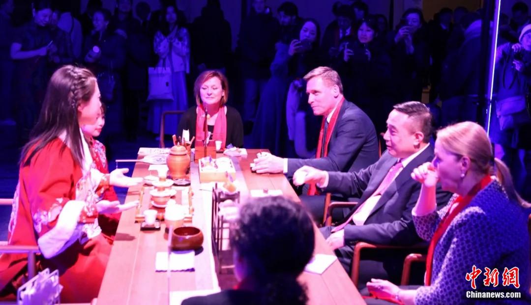 2025年2月13日,中國駐歐盟使團在布魯塞爾燈光節(jié)組織“光影茶榭”活動,中國駐歐盟使團團長蔡潤(右排圖中)邀請嘉賓品茗,體驗中國茶藝。中新社記者 德永健 攝