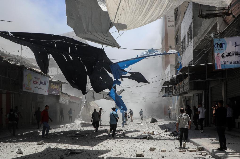 5月31日,人們?cè)诩由吵遣榭丛庖攒娨u擊后的廢墟。新華社發(fā)(里澤克·阿卜杜勒賈瓦德攝)