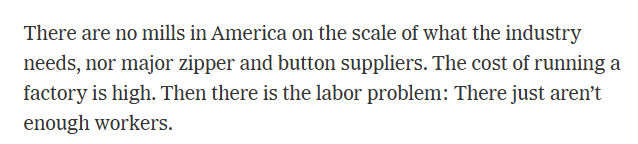 文章說(shuō),特朗普政府的高額關(guān)稅給企業(yè)帶來(lái)了巨大壓力,迫使企業(yè)的負(fù)責(zé)人一直在思考自己能在美國(guó)多生產(chǎn)多少產(chǎn)品。但是,美國(guó)既沒(méi)有滿(mǎn)足該行業(yè)需求的規(guī)模工廠,也沒(méi)有主要的拉鏈和紐扣供應(yīng)商。運(yùn)營(yíng)工廠的成本很高。此外還有勞動(dòng)力問(wèn)題:工人根本不夠用。