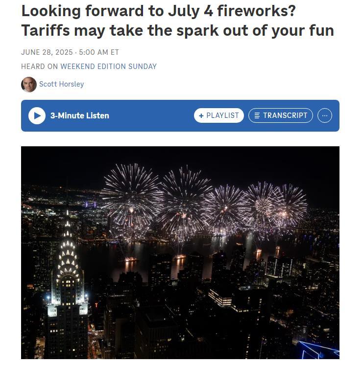 美國全國公共廣播電臺網(wǎng)站近日發(fā)表一篇文章說,美國人即將迎來獨(dú)立日慶典,燒烤派對、節(jié)日游行和煙花表演自然是重頭戲。但受特朗普政府加征關(guān)稅影響,今年煙花價格可能飆升,供應(yīng)也將更加緊俏。這是因?yàn)?,美國用于慶祝獨(dú)立日的火箭煙花、手持電光花和噴泉禮花,幾乎完全依賴中國供應(yīng)——而早在一千多年前,正是中國人發(fā)明了煙花。