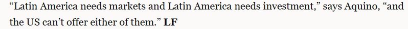 文章指出,并非所有人都對(duì)拉美與中國(guó)之間的合作感到滿(mǎn)意。華盛頓尤其擔(dān)心。不過(guò),許多人認(rèn)為華盛頓影響拉丁美洲的能力有限。文章援引利馬國(guó)立圣馬科斯大學(xué)的亞洲經(jīng)濟(jì)專(zhuān)家卡洛斯·阿基諾的話(huà)指出,“拉丁美洲需要市場(chǎng)和投資,但美國(guó)無(wú)法提供其中任何一項(xiàng)”。