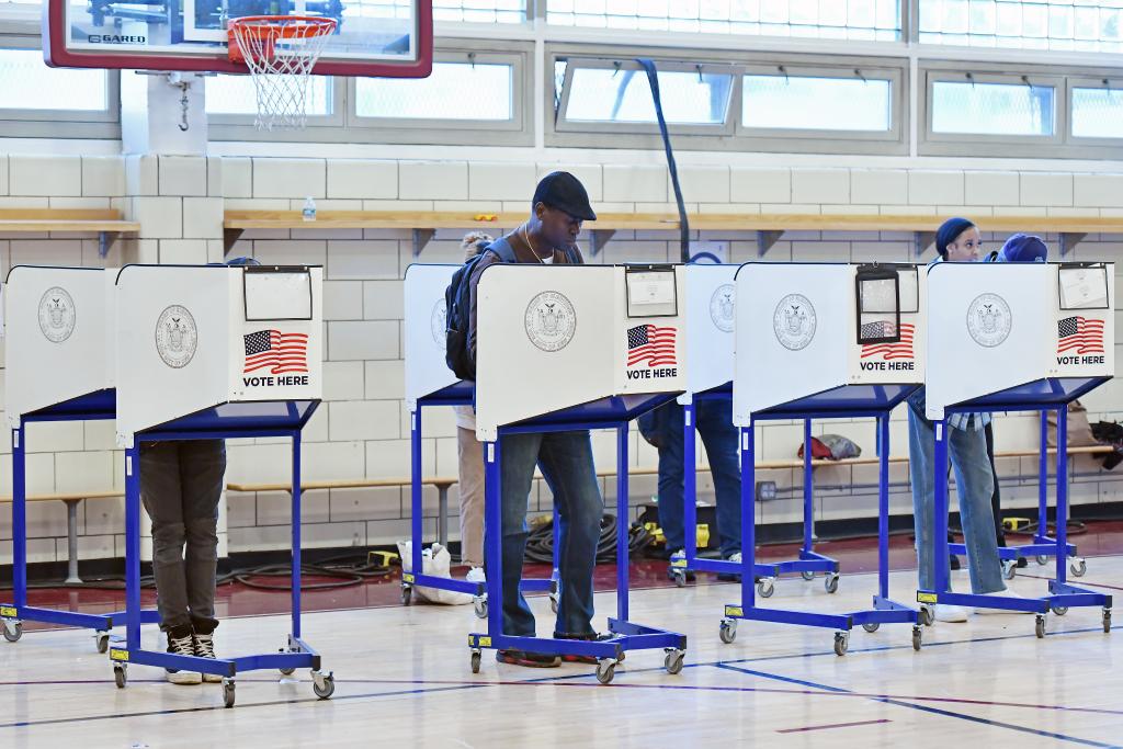 2024年11月5日,選民在美國(guó)紐約曼哈頓一處投票站填寫(xiě)選票。新華社記者李睿攝
