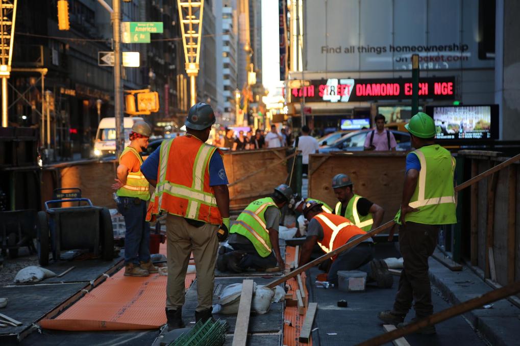 6月24日,建筑工人在美國(guó)紐約曼哈頓街頭工作。新華社記者劉亞南攝