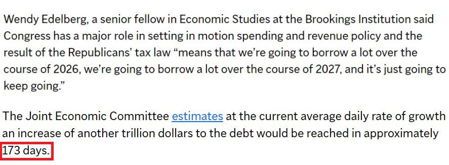 據美國國會聯合經濟委員會估計,按照目前的日均增長速度,美債總額將在大約173天內再增加1萬億美元。