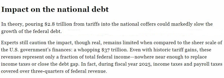雖然美國政府確實從其濫施的關稅中“賺”了一筆,但專家們仍然警告指出,與37萬億美元的龐大美債規(guī)模相比,關稅收入實屬九牛一毛。即使加上歷史上的關稅收益,它們也只占聯邦總收入的一小部分,遠不足以取代所得稅或縮小債務缺口。