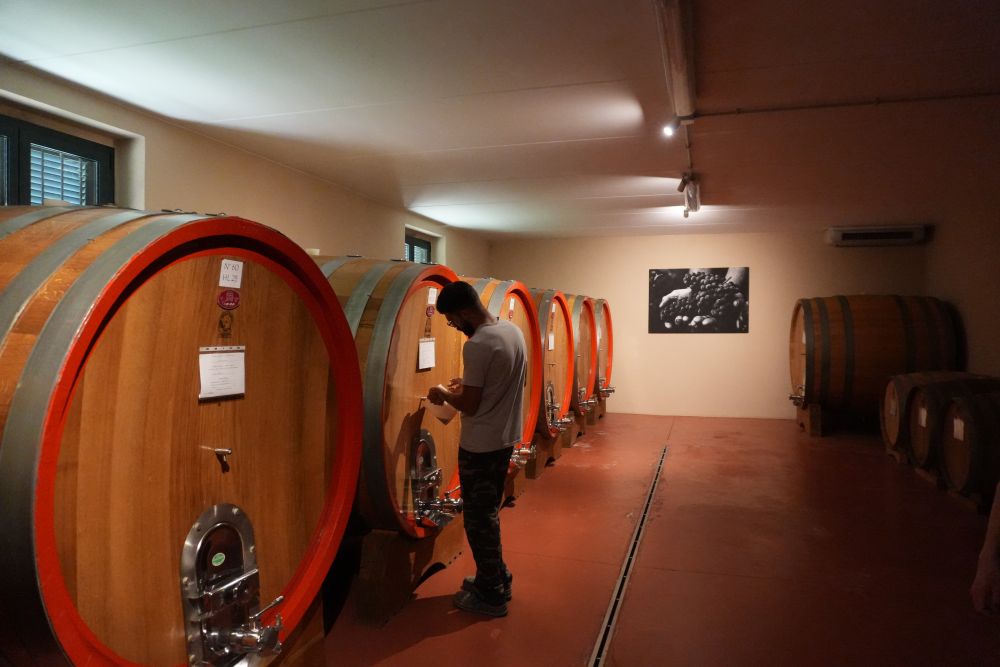 8月17日,在意大利拉莫拉鎮(zhèn),馬斯卡雷洛家族酒莊負(fù)責(zé)人法比奧·馬斯卡雷洛在酒窖里工作。新華社記者張馨文攝