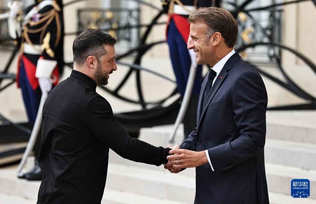 9月4日,在法國(guó)首都巴黎的總統(tǒng)府愛(ài)麗舍宮,法國(guó)總統(tǒng)馬克龍(右)迎接出席“志愿聯(lián)盟”線上會(huì)議的烏克蘭總統(tǒng)澤連斯基。新華社記者 高靜 攝