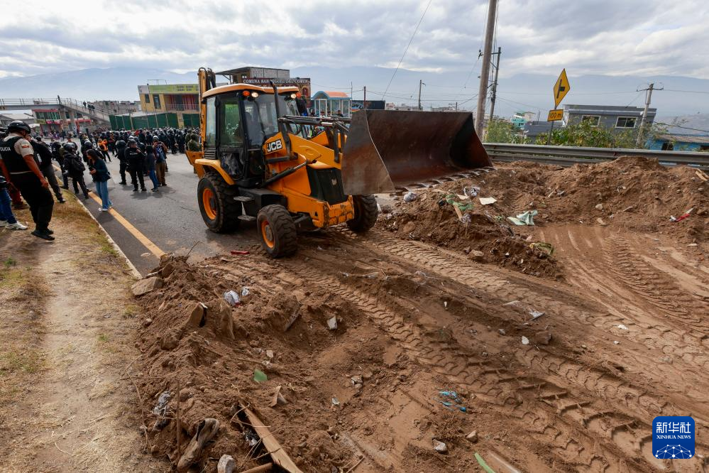 9月16日,在厄瓜多爾首都基多,一輛推土機(jī)在清理示威者設(shè)置的路障。新華社發(fā)(里卡多·蘭德塔攝)