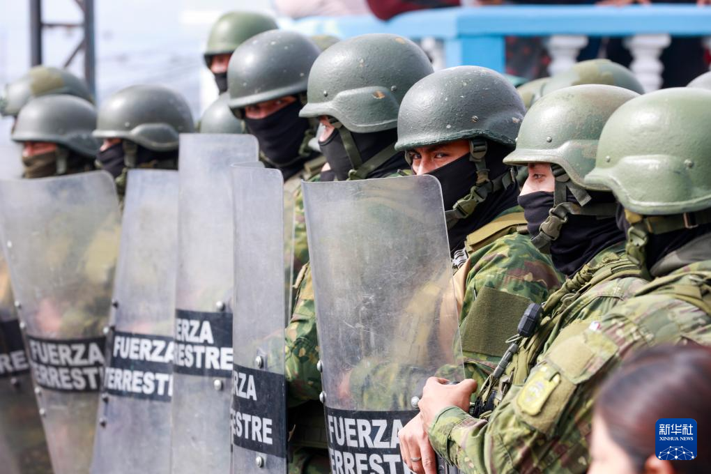 9月16日,在厄瓜多爾首都基多,武裝部隊(duì)人員維持秩序。新華社發(fā)(里卡多·蘭德塔攝)