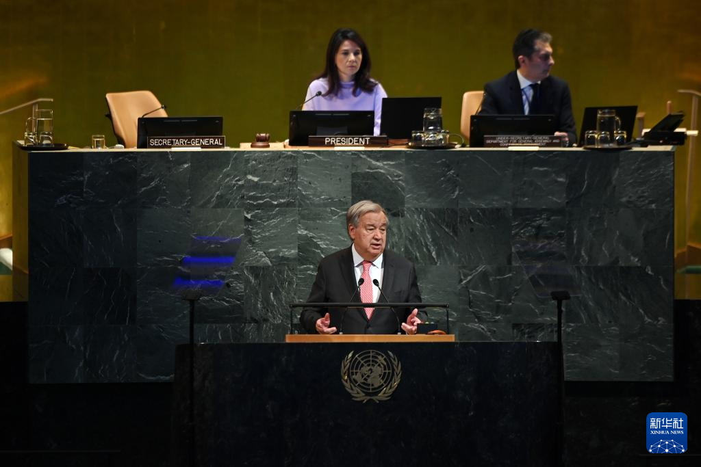 9月22日,在位于紐約的聯(lián)合國總部,聯(lián)合國秘書長安東尼奧·古特雷斯(前)在紀(jì)念聯(lián)合國成立80周年高級(jí)別會(huì)議上講話。新華社記者 李睿 攝