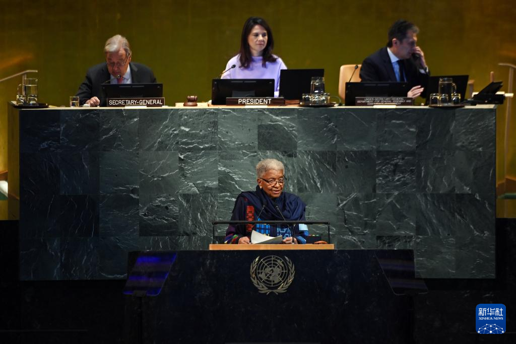 9月22日,在位于紐約的聯(lián)合國總部,第80屆聯(lián)合國大會(huì)主席安娜萊娜·貝爾伯克(前)在紀(jì)念聯(lián)合國成立80周年高級(jí)別會(huì)議上講話。新華社記者 李睿 攝