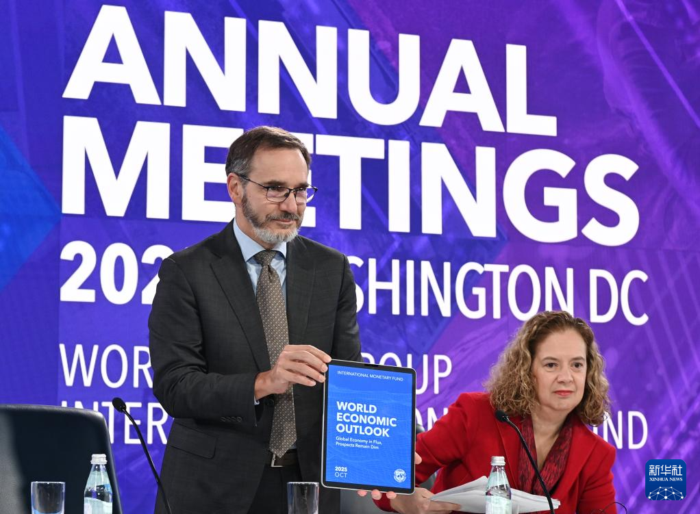 10月14日,在美國華盛頓,國際貨幣基金組織首席經(jīng)濟(jì)學(xué)家皮埃爾-奧利維耶·古蘭沙(左)在《世界經(jīng)濟(jì)展望報(bào)告》新聞發(fā)布會上展示報(bào)告。新華社記者 李睿 攝