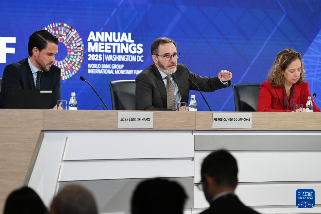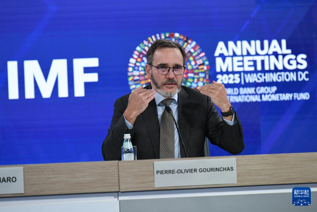 10月14日,在美國華盛頓,國際貨幣基金組織首席經(jīng)濟(jì)學(xué)家皮埃爾-奧利維耶·古蘭沙(中)在《世界經(jīng)濟(jì)展望報(bào)告》新聞發(fā)布會上講話。新華社記者 李睿 攝