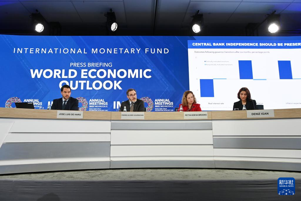 10月14日,在美國華盛頓,國際貨幣基金組織首席經(jīng)濟(jì)學(xué)家皮埃爾-奧利維耶·古蘭沙(左二)在《世界經(jīng)濟(jì)展望報(bào)告》新聞發(fā)布會上講話。新華社記者 李睿 攝