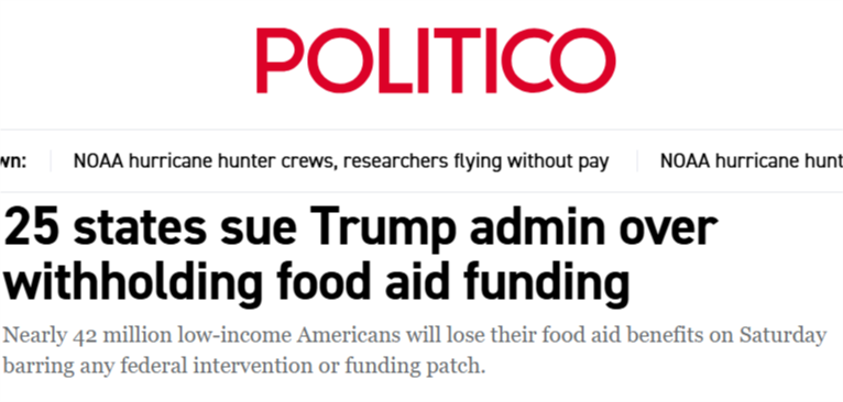 據(jù)美國(guó)《政治報(bào)》網(wǎng)站報(bào)道,受政府持續(xù)“停擺”影響,美農(nóng)業(yè)部宣布暫停其“補(bǔ)充營(yíng)養(yǎng)援助計(jì)劃”(SNAP),11月1日起停止發(fā)放食品救濟(jì)。目前這一項(xiàng)目覆蓋約4200萬(wàn)人,約占美國(guó)總?cè)丝诎朔种唬渲卸鄶?shù)為低收入群體和殘障人士。SNAP項(xiàng)目暫停后,他們的生活將難以為繼。當(dāng)?shù)貢r(shí)間28日,民主黨主政的25個(gè)州和首都華盛頓對(duì)聯(lián)邦政府提起訴訟,要求動(dòng)用聯(lián)邦應(yīng)急資金,以維持這一項(xiàng)目。