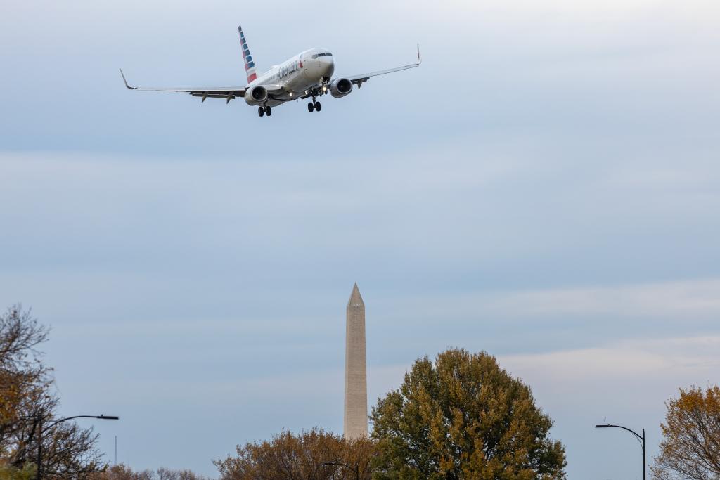 11月7日,一架美國航空公司飛機準備降落在美國弗吉尼亞州阿靈頓的里根國家機場。新華社記者胡友松攝