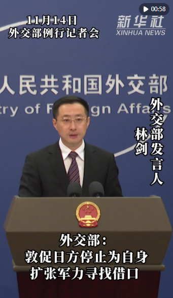 新華社北京11月14日電(記者董雪、劉楊)外交部發(fā)言人林劍11月14日表示,中方對日方近期軍事安全動向感到嚴重關切,敦促日方停止為自身擴張軍力尋找借口。