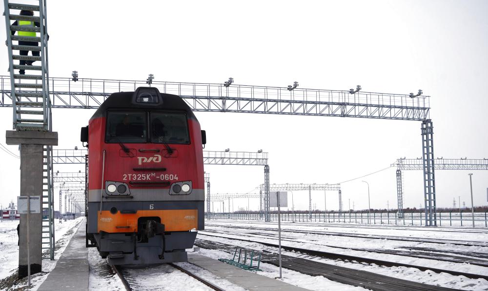 12月6日,一輛即將開往中國的俄羅斯貨運列車??吭诙砹_斯下列寧斯闊耶鐵路口岸。新華社記者 劉愷 攝