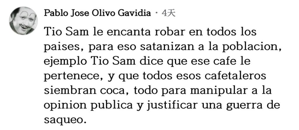 網(wǎng)友巴勃羅·奧利沃留言說:“山姆大叔喜歡在所有國家盜竊,為此他們妖魔化民眾,譬如山姆大叔說那片咖啡園是屬于他的,還說所有那些咖啡農(nóng)在種植古柯,所有這一切都是為了操弄輿論,為了給他們的掠奪戰(zhàn)爭辯護?!?/p>