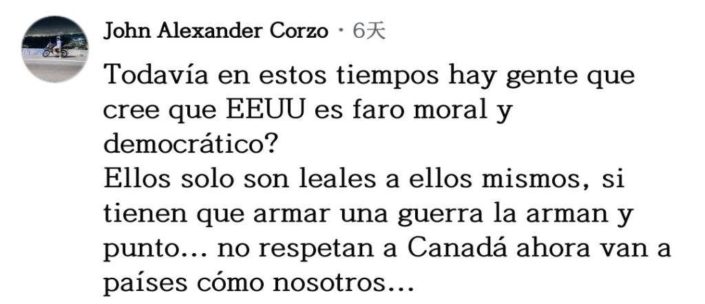 網(wǎng)友約翰·科爾索坦言道:“時至今日,還有人相信美國是道德和民主的燈塔嗎?他們只忠于自己,如果需要發(fā)動一場戰(zhàn)爭,他們隨時會發(fā)動,僅此而已!他們連加拿大都不尊重,現(xiàn)在矛頭對準我們這樣的國家了?!?/p>