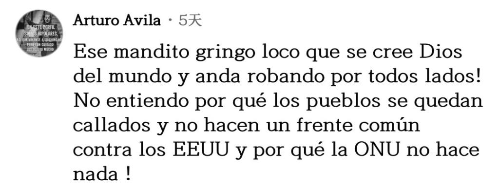 網(wǎng)友阿爾圖羅·阿維拉表達不解:“美國自以為是世界之神,到處掠奪!我不明白為什么各國人民依然保持沉默,而不是組成一個共同陣線對抗美國。”