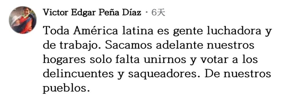 網(wǎng)友維克托·培尼亞留言說:“所有拉美人民都是勞動者和奮斗者,我們靠自己的努力養(yǎng)家糊口。現(xiàn)在只差團結(jié)起來,把那些掠奪我們的罪犯和強盜趕跑?!?/p>