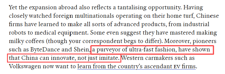 文章分析認為,中國企業(yè)在海外的影響力正逐年增強,覆蓋國家多元,涉足行業(yè)日益廣泛。去年中國某電動汽車制造商的銷量超越了美國龍頭特斯拉。中國AI模型正被全球采用,不僅受發(fā)展中國家青睞,一些西方企業(yè)也在使用。