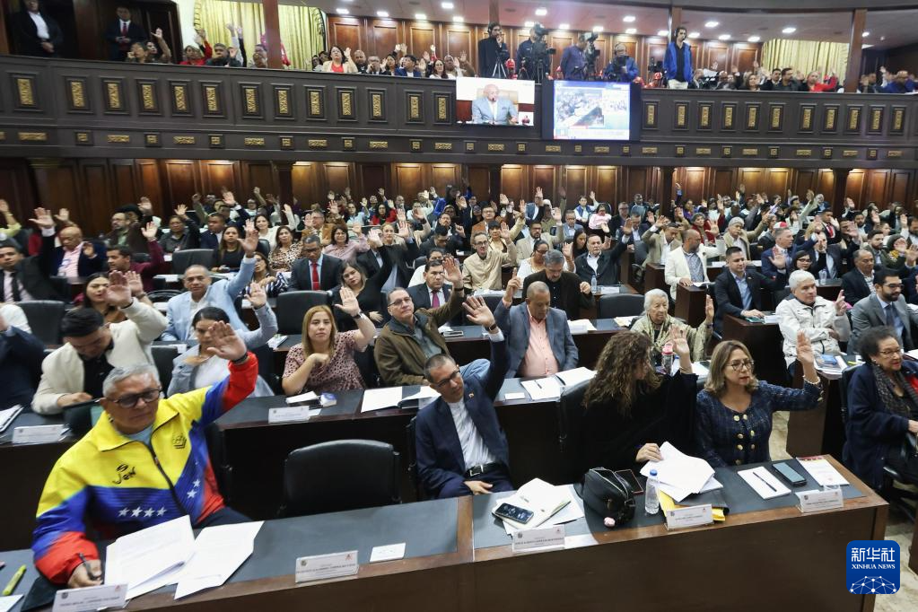 1月29日,在委內(nèi)瑞拉首都加拉加斯,議員們?cè)谖瘍?nèi)瑞拉立法機(jī)構(gòu)全國代表大會(huì)例行會(huì)議上舉手表決。新華社發(fā)(委內(nèi)瑞拉全國代表大會(huì)供圖)