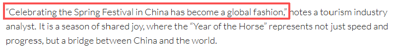 報(bào)道認(rèn)為,春節(jié)是一個(gè)共享歡樂(lè)的節(jié)日,馬年所象征的不僅是迅捷與進(jìn)步,更是一座連接中國(guó)與世界的橋梁。一位旅游分析師在報(bào)道中表示:“在中國(guó)過(guò)春節(jié)已成為一種全球時(shí)尚。”