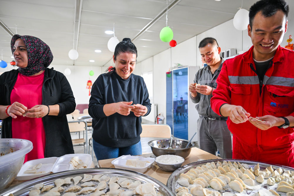 2月16日,在土耳其阿克薩拉伊省圖茲湖地下天然氣儲庫擴(kuò)建項(xiàng)目二期工程營地,中土兩國職工在一起包餃子。新華社記者劉磊攝