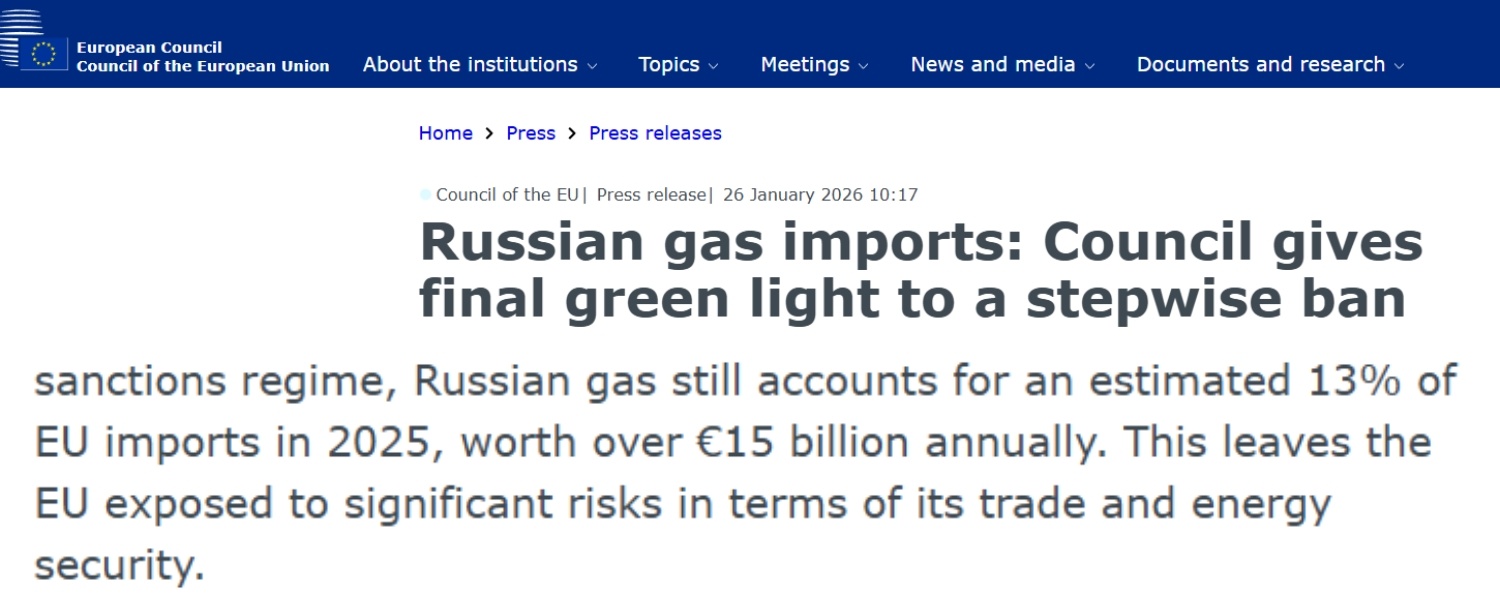 歐盟27個(gè)成員國(guó)1月26日正式通過(guò)關(guān)于逐步禁止從俄進(jìn)口管道天然氣和液化天然氣的法規(guī)。對(duì)從俄進(jìn)口液化天然氣的全面禁令將于2027年年初生效,對(duì)進(jìn)口管道天然氣的全面禁令將于2027年秋季生效。2025年,俄天然氣約占?xì)W盟進(jìn)口總量的13%,價(jià)值超過(guò)150億歐元。