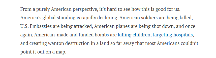 文章作者稱,(美國(guó))這場(chǎng)“無緣無故且非法的軍事行為”已將地區(qū)拖入暴力升級(jí)的漩渦,導(dǎo)致數(shù)百名無辜平民喪生。即便從美國(guó)自身利益視角看,此舉亦難言獲益——美國(guó)全球地位正迅速下降,美軍士兵不斷傷亡,使館與飛機(jī)遭襲,而美國(guó)制造或資助的炸彈仍在遙遠(yuǎn)土地上造成平民死傷與基礎(chǔ)設(shè)施破壞。