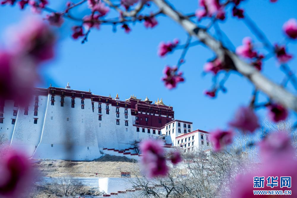 在位于拉薩北部的古剎帕邦喀附近拍攝的盛開的桃花,遠(yuǎn)處是布達(dá)拉宮(4月9日攝)。新華社記者 丁增尼達(dá) 攝