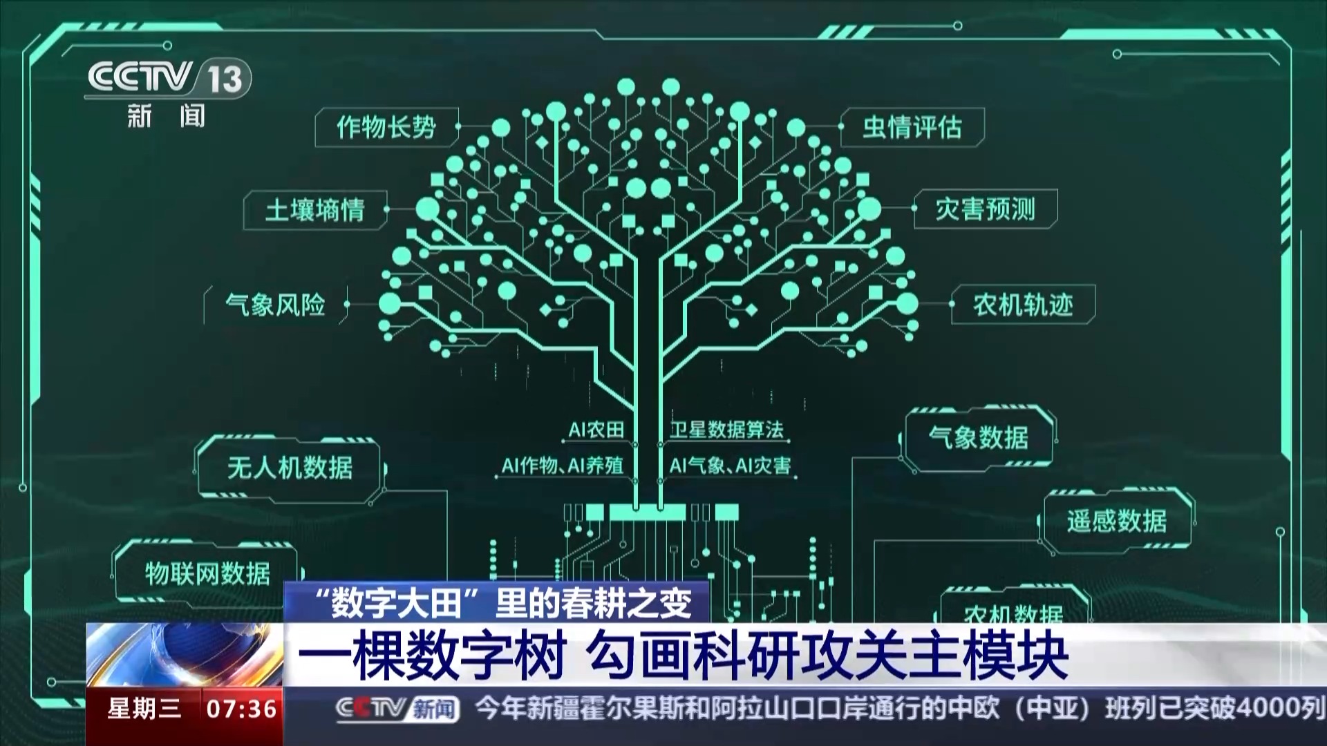 從眼前這個(gè)樹狀協(xié)作圖基本可以看出團(tuán)隊(duì)的架構(gòu):樹根是多維大數(shù)據(jù),由遙感衛(wèi)星、氣象、物聯(lián)網(wǎng)等收集從天到地的農(nóng)業(yè)數(shù)據(jù),遙感團(tuán)隊(duì)、氣象團(tuán)隊(duì)負(fù)責(zé)數(shù)據(jù)收集、預(yù)處理;樹干是骨架,由遙感、氣象以及人工智能人員組成團(tuán)隊(duì)建模,對基座數(shù)據(jù)進(jìn)行分析;樹冠是數(shù)據(jù)成果,長出田塊位置、作物長勢、災(zāi)害預(yù)警等信息。最后通過計(jì)算機(jī)工程師的搭建,一塊塊數(shù)字農(nóng)田就出現(xiàn)在屏幕里。