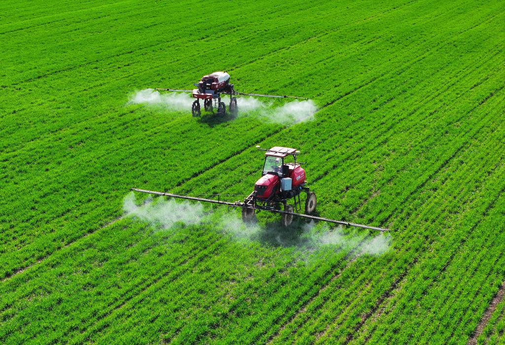 3月19日,自走式無人植保機(jī)在安徽省亳州市譙城區(qū)趙橋鄉(xiāng)雙樓村的無人農(nóng)場進(jìn)行除草作業(yè)(無人機(jī)照片)。新華社記者 杜宇 攝