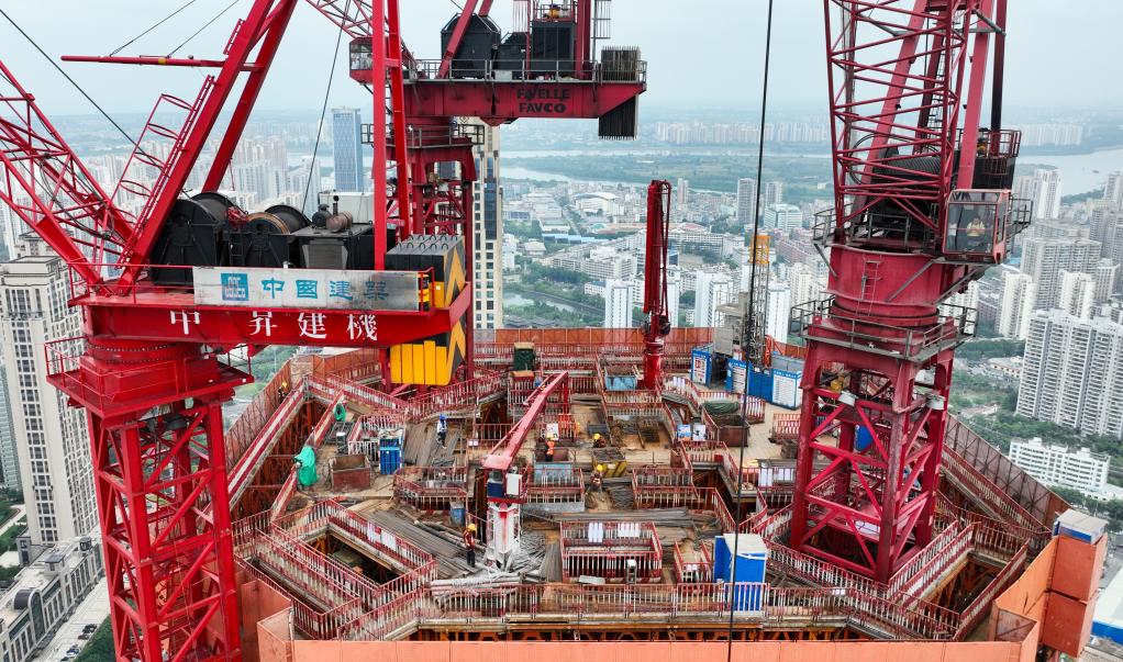 4月12日,工人在海口市海南中心項(xiàng)目施工作業(yè)(無人機(jī)照片)。新華社記者 楊冠宇 攝