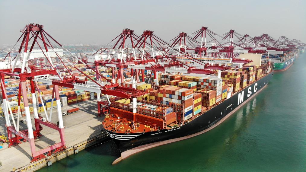 3月13日,貨輪在山東港口青島港裝卸集裝箱(無人機(jī)照片)。新華社記者 李紫恒 攝