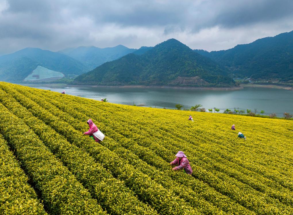 4月7日,茶農(nóng)在浙江省寧波市鄞州區(qū)橫溪茶園采茶(無人機(jī)照片)。新華社發(fā)(胡學(xué)軍攝)