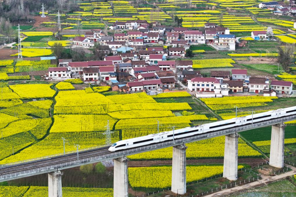 3月20日,西成高鐵線上的列車駛過陜西漢中市南鄭區(qū)陽春鎮(zhèn)(無人機(jī)照片)。新華社記者 邵瑞 攝