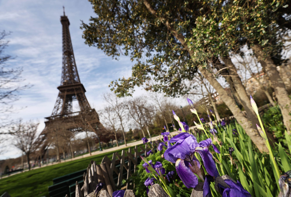 3月20日,法國巴黎埃菲爾鐵塔下春花綻放。新華社記者 高靜 攝