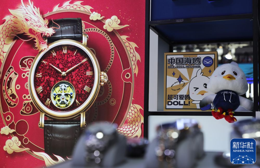 圖為天津館海鷗國(guó)潮風(fēng)格手表展柜。本屆消博會(huì)上,“老字號(hào)”帶來的國(guó)潮新品不僅有著海派文化和傳統(tǒng)文化元素,還與獨(dú)具匠心的年輕創(chuàng)意相融合。