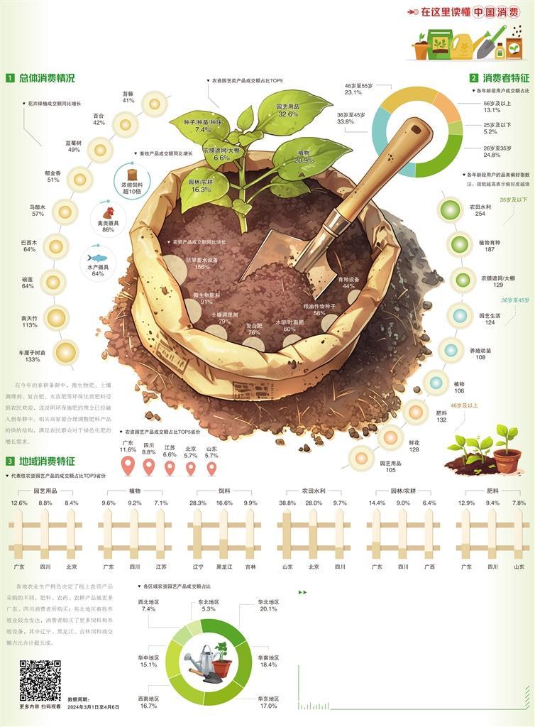 此外,畜牧業(yè)生產(chǎn)、城市花草種植需求也成為春耕消費的新亮點。鄉(xiāng)村養(yǎng)殖戶抓住春季時節(jié)推進(jìn)畜禽填槽補欄,濃縮飼料、禽類器具、水產(chǎn)器具成為受歡迎的產(chǎn)品,其中濃縮飼料的成交額同比增長超10倍。城市居民購買了更多的花卉綠植,為自家陽臺、花園、辦公室增添濃濃春意,車?yán)遄訕涿?、南天竹、巴西木、郁金香是最受青睞的品類。