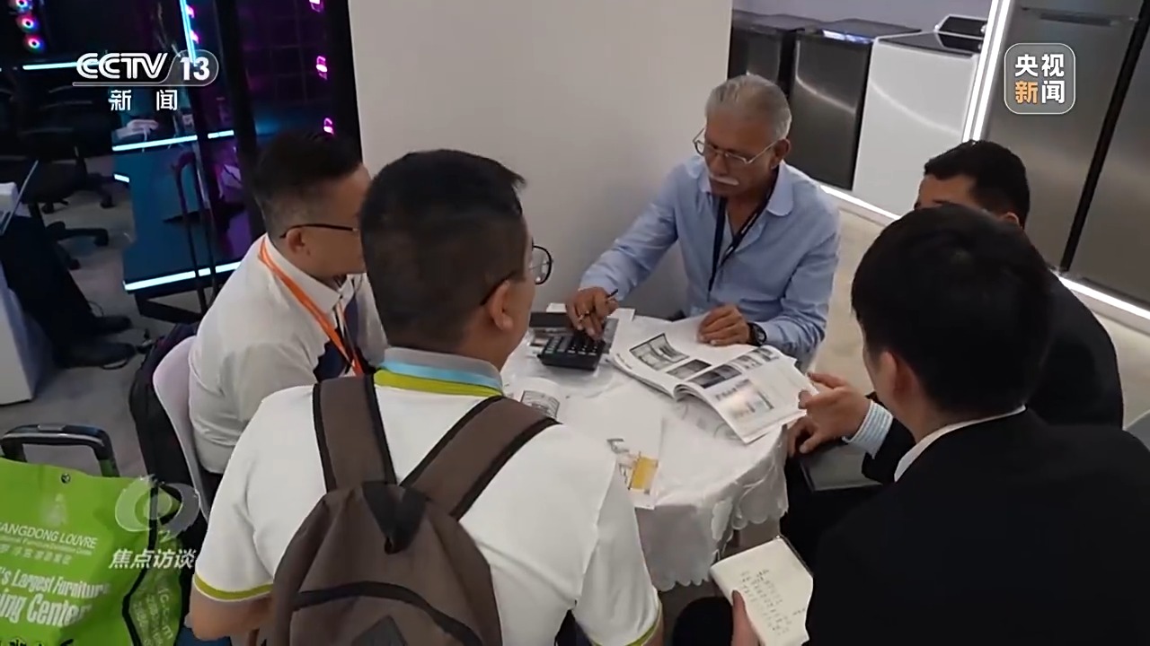 采訪期間,記者還偶遇了兩位來自共建“一帶一路”國家委內(nèi)瑞拉的采購商。因?yàn)椴少徑痤~較大,涵蓋電視、洗衣機(jī)、空調(diào)等全品類電器,因此他們專程趕到中山出口基地進(jìn)行考察。