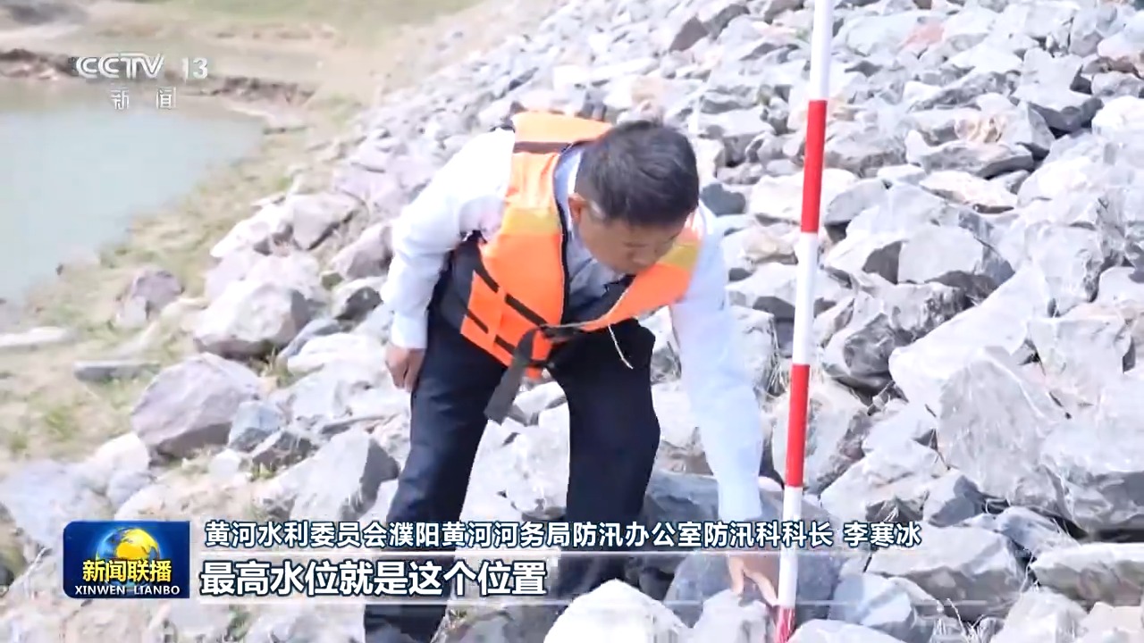 黃河水利委員會(huì)濮陽(yáng)黃河河務(wù)局防汛辦公室防汛科科長(zhǎng) 李寒冰:(過(guò)去)黃河河道淤積十分嚴(yán)重,最高洪水位接近壩頂了。(現(xiàn)在)河道泥沙少了3米多,最高水位就是這個(gè)位置,從這個(gè)位置向上,就是我們調(diào)水調(diào)沙調(diào)出來(lái)的安全空間。