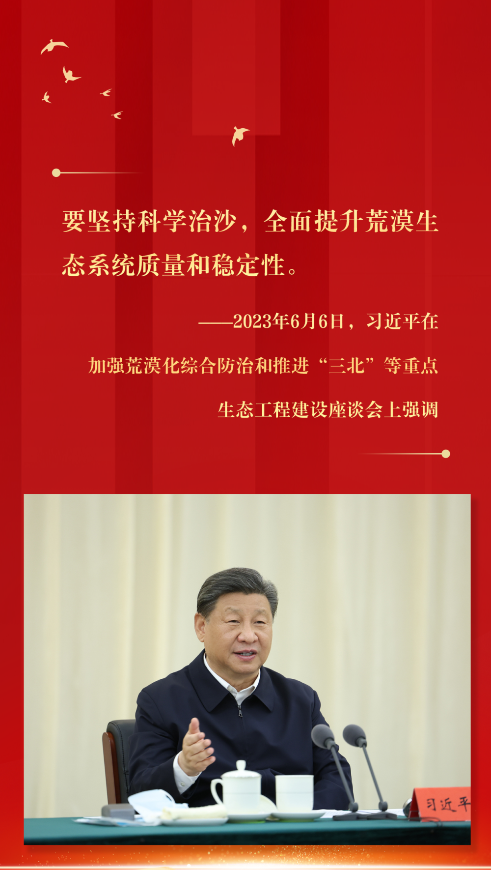 2023年6月5日至6日,習(xí)近平在內(nèi)蒙古巴彥淖爾考察,并主持召開加強荒漠化綜合防治和推進“三北”等重點生態(tài)工程建設(shè)座談會。這是6日上午,習(xí)近平在臨河區(qū)國營新華林場考察。