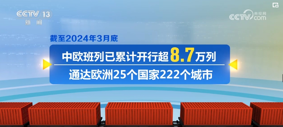2024年一季度,中歐班列累計(jì)開行4541列、發(fā)送貨物49.3萬標(biāo)箱,同比分別增長(zhǎng)9%、10%。截至2024年3月底,中歐班列已累計(jì)開行超8.7萬列,通達(dá)歐洲25個(gè)國(guó)家222個(gè)城市。
